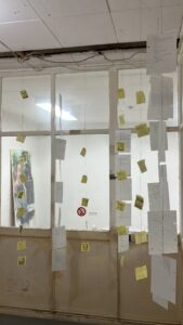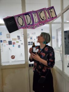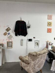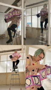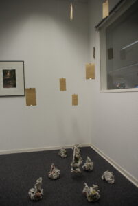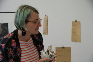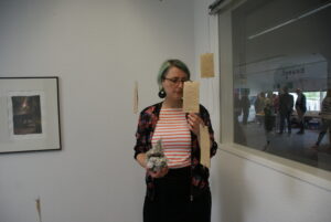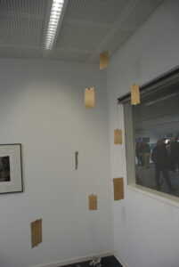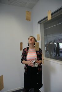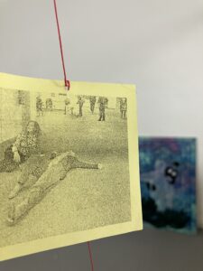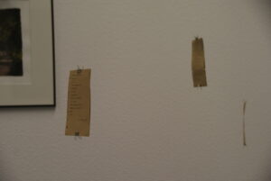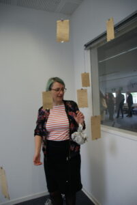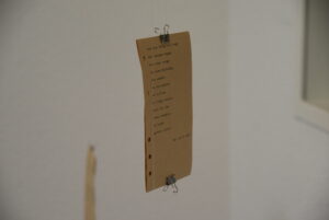 Bei der ArtArtist 2024 installierte ich meine Gedichte, die auf Schreibmaschine geschrieben waren, an Nylonfäden an der Decke und befestigte als Gegengewicht zusammengeknülltes Zeitungspapier. So konnte man sich die Gedichte zum Lesen runterziehen. Durch die Luftzüge bewegten sich die Gedichte passend zu unserem Thema der Gruppenausstellung “bewegt.”.