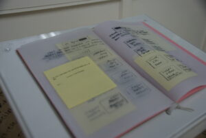 Ende 2023 begann ich mit der Arbeit an einem Gigazine. Ich hatte Lust ein Zine aus einem großen Papier zu falten und nutzte die komplette Wand in meinem Atelier für diese Zwecke. Thematisch enthält es die Geschichte des Familiengeschichten-Zines und ich stellte es zur Nacht der Museen 2024 in unserem Atelier aus: