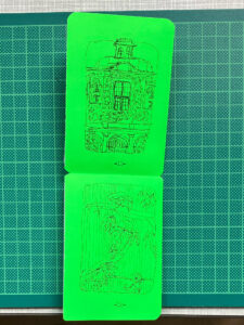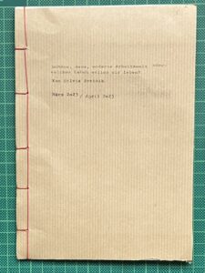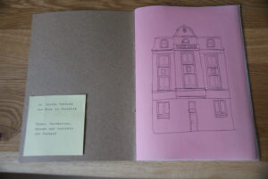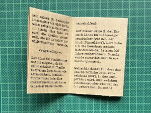 Im April 2025 stellte ich bei der Nacht der Museen in unserem Atelier kunst + tonic mein Projekt “BewohnerInnen meines Hauses in Oberbilk 1920-1962” vor. Es ist eine Weiterentwicklung meiner Idee, die im November 2022 entstand und hier zu finden ist: “Das Haus in Oberbilk”. Für die Nacht der Museen hatte ich eine Version mit Transparentpapier und Post Its gestaltet, für den Verkauf dann eine Version mit Einlegern aus DIN A5 Papier und Transparentpapier. Für den Zinetausch #8 (April 24) dann eine Version mit verschieden farbigen Papier. Für jedes Jahr zwischen 1920-1962 habe ich die BewohnerInnen meines Hauses in alten Adressbücher recherchiert und für jede Änderung eine eigene Seite auf Transparentpapier gestaltet. Dazu habe ich einen Text geschrieben, den ich seit November 2022 aktualisiert habe, denn durch neue Quellen standen mir mehr Informationen zur Verfügung. Das Bild auf dem Titel ist ein Linolschnitt des Stadtteils Oberbilk von mir, zu dessen Entstehen gibt es ein Video auf Instagram.