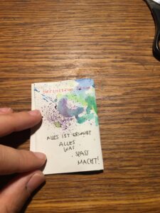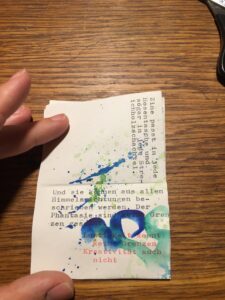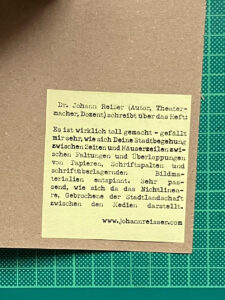 Für den Zinetausch #9, habe ich mein Mintropplatz-Gedicht in Form eines Zines gestaltet. Es hat drei Seiten, in die Fotografien mittels Transparentpapier eingefädelt sind. Bei einer Wohnzimmerlesung traf ich auf Dr. Johann Reißer und Ursula Seeger, denen ich ein Exemplar in die Hand drückte. Ungefragt schrieb Johann Reißer über mein Heft: